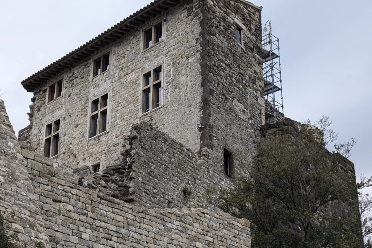Après avoir dépassé le château, imposant, fier, sereinement assis sur d’énormes prismes basaltiques, nous arrivons sur une esplanade, véritable scène, ouverte sur l’une des plus belles représentations : la formation complexe de la Provence.