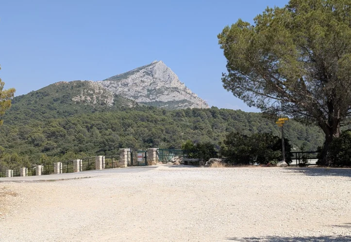 Les D 10 et D 17 (Route Cézanne)[11] sont les principales routes qui permettent de longer le massif. Sur le versant septentrional, la D10 franchit le col de Claps (530 m) et le col des Portes (631 m). Sur le versant méridional, la D 17 chemine sur le plateau du Cengle et franchit le collet Blanc du Subéroque (505 m). Le massif culmine au pic des Mouches (1 011 m pour l'IGN)[], près de l'extrémité est de la chaîne, et non pas à la Croix de Provence (946 m pour l'IGN) proche de l'extrémité ouest et visible d'Aix. Le pic des Mouches est l'un des plus hauts sommets du département des Bouches-du-Rhône, après le pic de Bertagne qui atteint l'altitude de 1 042 mètres[] et qui se situe sur le massif de la Sainte-Baume. 6 525 ha du massif de la Sainte-Victoire sont classés depuis 1983.